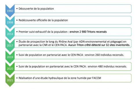 Depuis sa découverte en 1960 la population Arlésienne de Triton crêté a fait l'objet de nombreuses études, visant à améliorer la connaissance de la population (paramètres démographiques : effectif, survie, âge/sexe ratio...), ainsi qu'à rechercher d'autres populations potentielles en basse vallée du Rhône.
